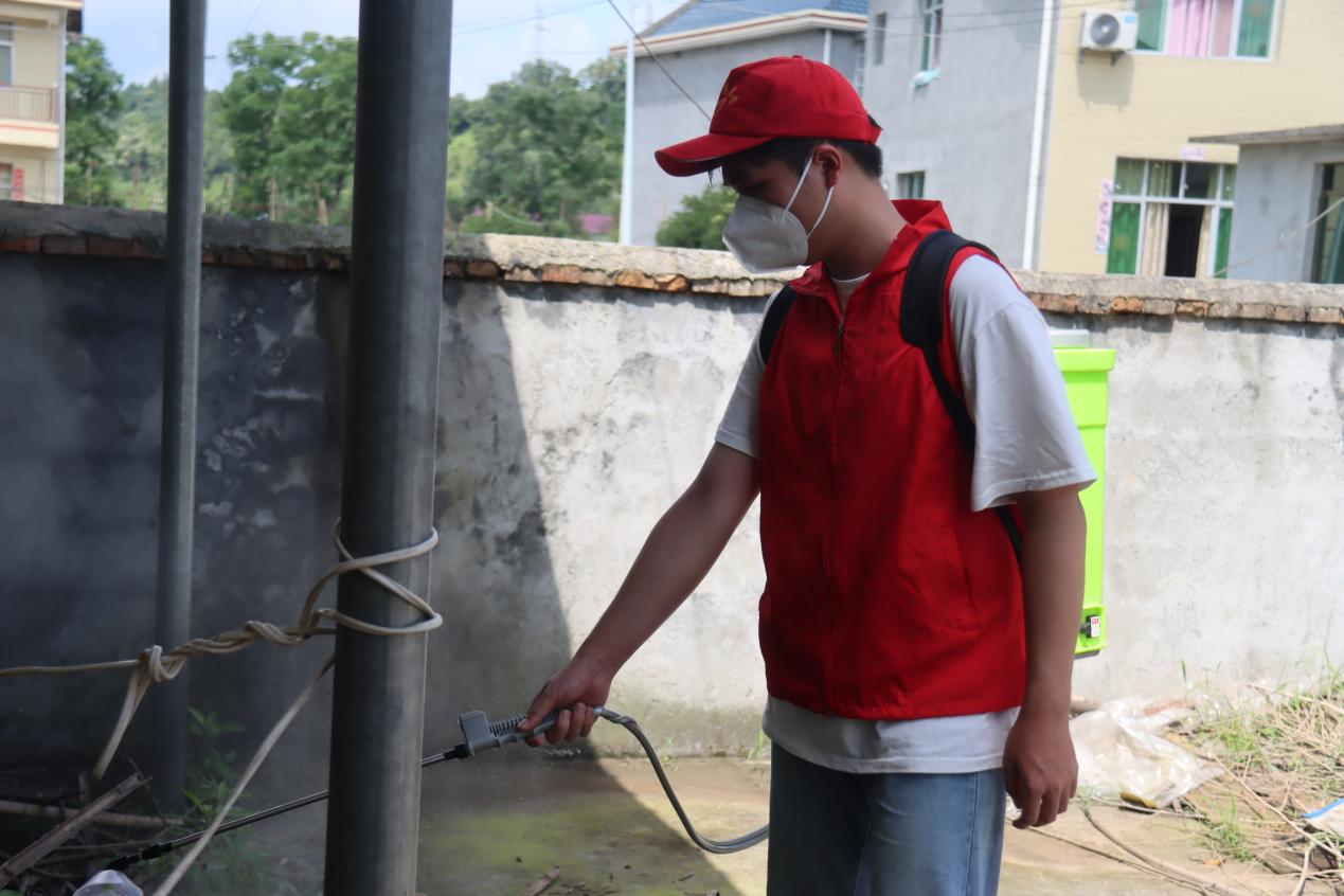 因受连续降雨的影响,顺福村受灾严重,此次践行团的主要任务是配合进行灾后消杀、开展防疫宣传以及防溺水宣传。活动中,志愿者们佩戴口罩,肩背喷雾器对水淹的区域进行全面消毒,有效遏制了疾病的传播。同时,志愿者们通过发放宣传手册的方式,积极向村民普及防疫、防溺水等安全知识,增强村民们的安全防护意识。